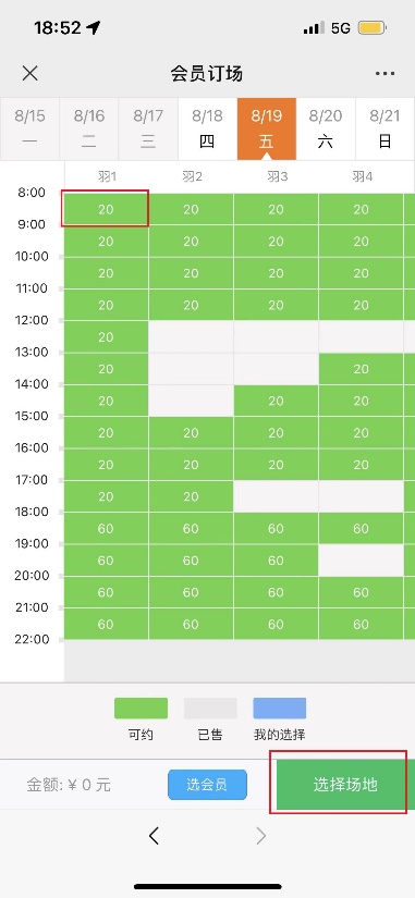 3.选择日期→时间→场地号→选会员→选择场地(注:可预订当天及未来4天的运动场地)