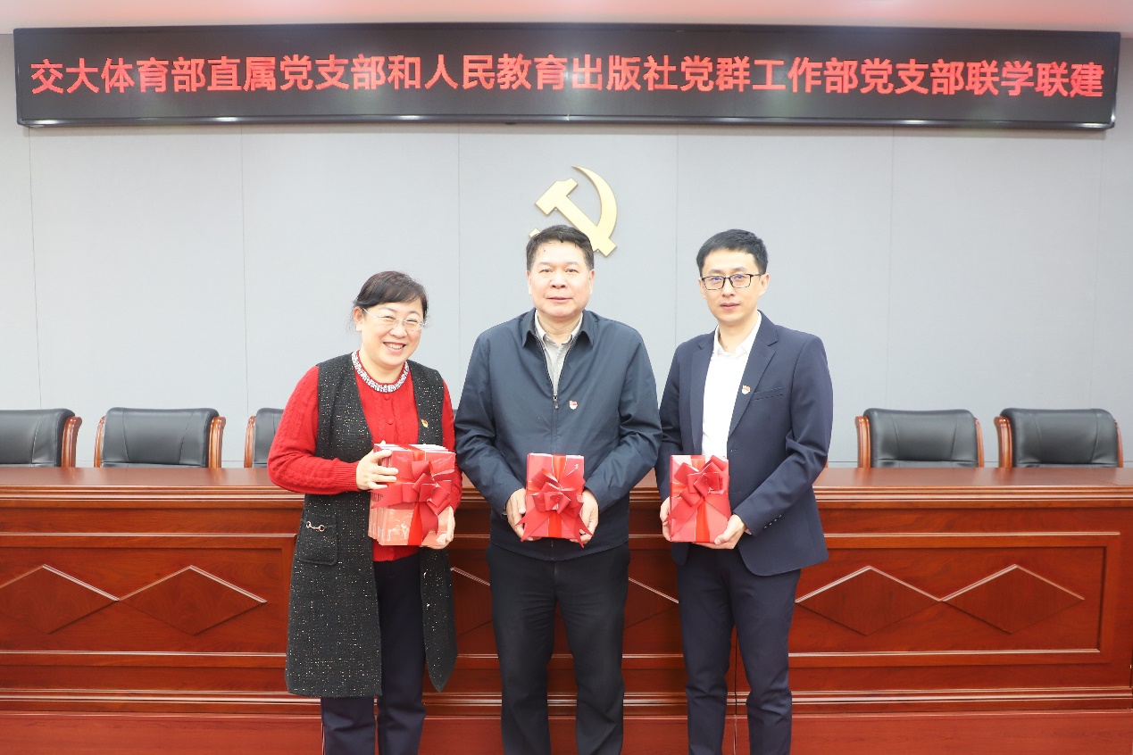 郑旺全代表人民教育出版社向体育部直属党支部赠送《名家史学精讲》《红色文物青年说》《百年先锋》等精品图书。这批蕴含红色基因的经典著作,将作为体育课程思政建设的重要资源,助力打造"体育+人文"特色育人平台。