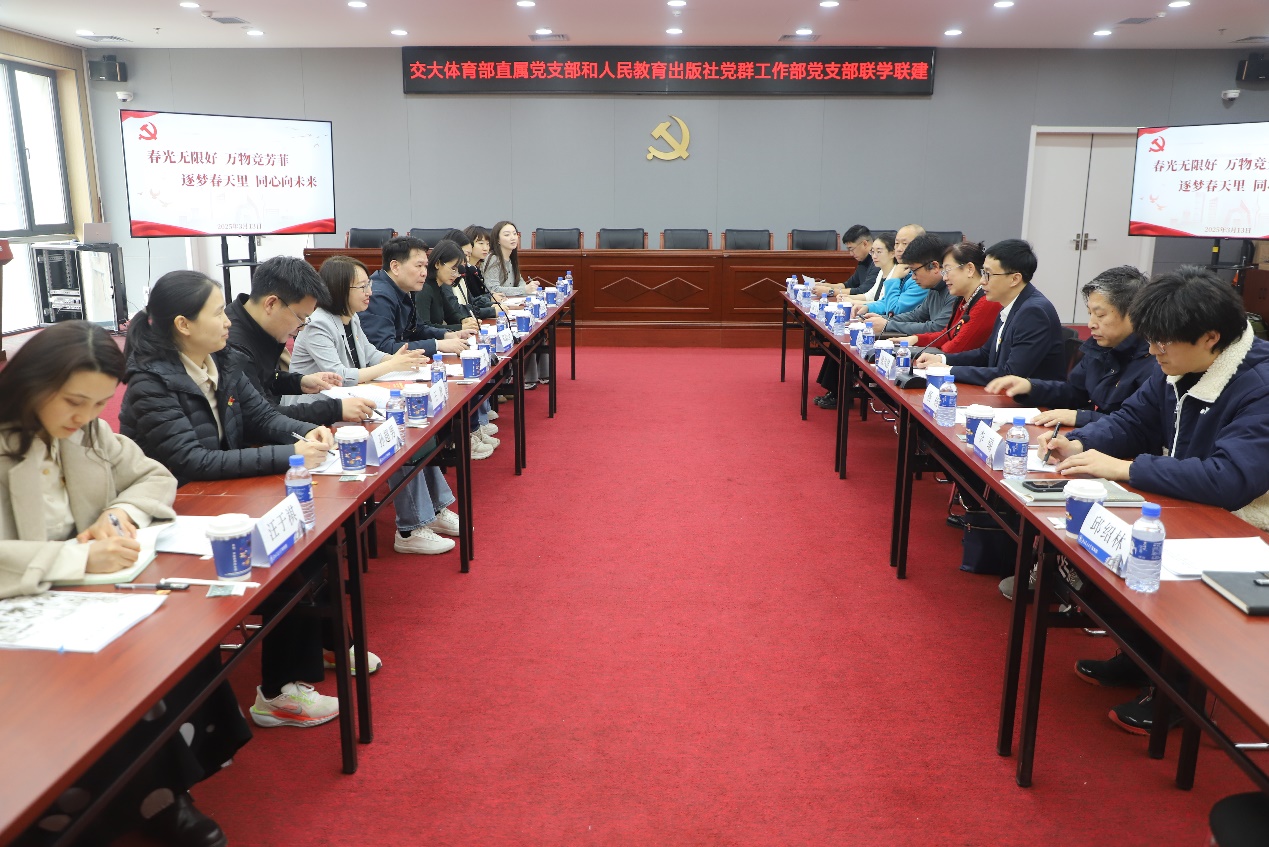 梁凤波、李鑫分别介绍了支部建设成果与特色工作。梁凤波重点分享了支部在课程思政、体育品牌建设中的经验;李鑫围绕以红色出版助力教育强国,阐述了党建与教材编研、文化传播深度融合的实践探索,介绍了适合高校的红色教育出版物。随后,双方就后续的合作路径进行了讨论。