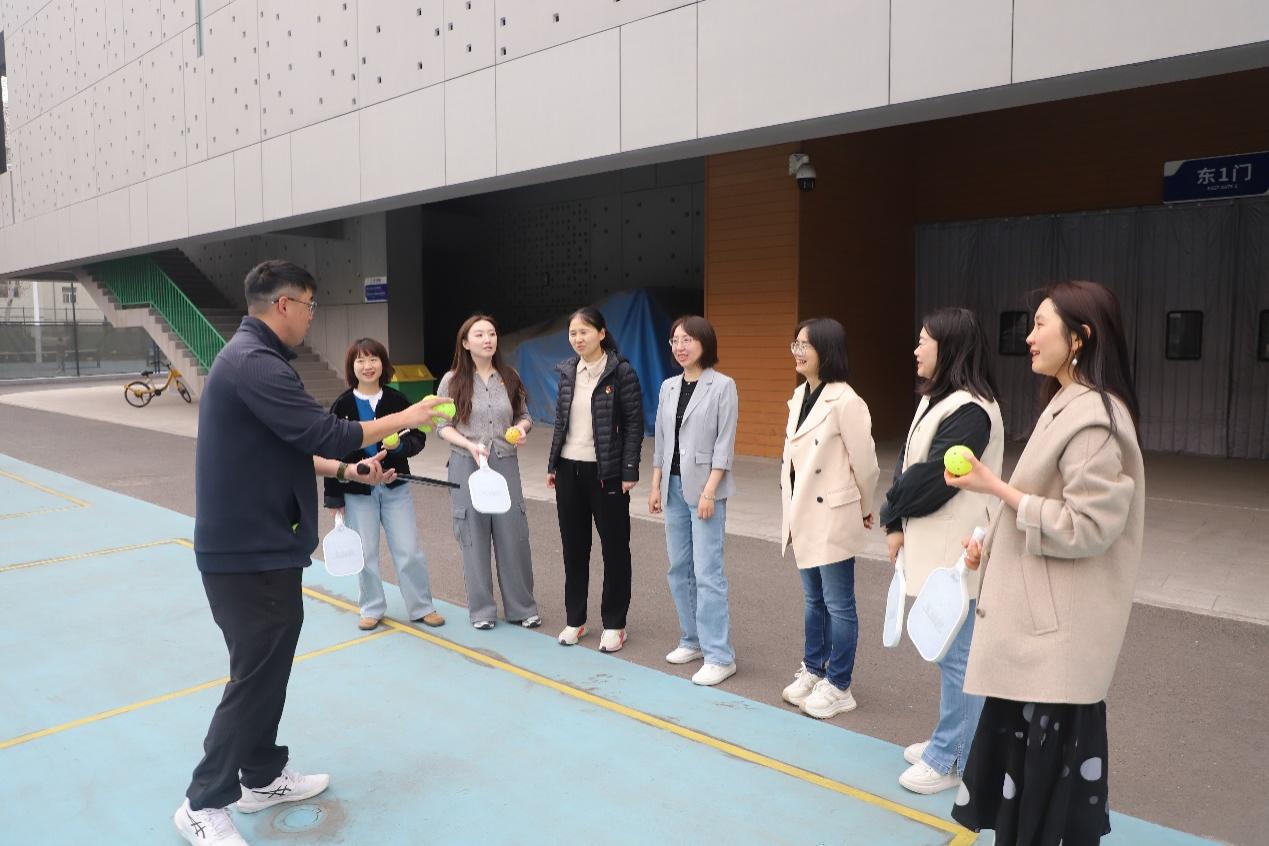 在实践体验阶段,人教社党员参观了交大综合体育馆,体验了新兴运动匹克球,体育部青年教师张汉锋带领大家在挥拍中感受体育的魅力和精神。这种“理论+实践”“学习+运动”的特色形式,生动诠释了体教融合理念,为后续合作注入新动能。